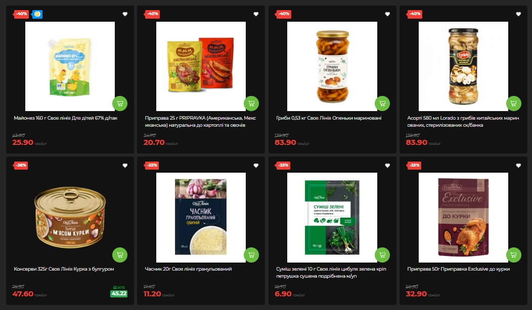 Большинство майонезов и соусов на этой неделе со скидкой 33%. Майонез "Олис", "Щедро", "Королевский Вкус", соусы Gusto и "Олис" — все идут по акционным ценам. Майонез "Своя Линия для детей" 160 г — минус 40%. Опята маринованные "Своя Линия" 530 г и ассорти Lorado из китайских грибов — минус 40%, по 83,90 грн.