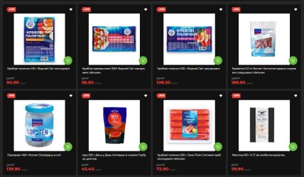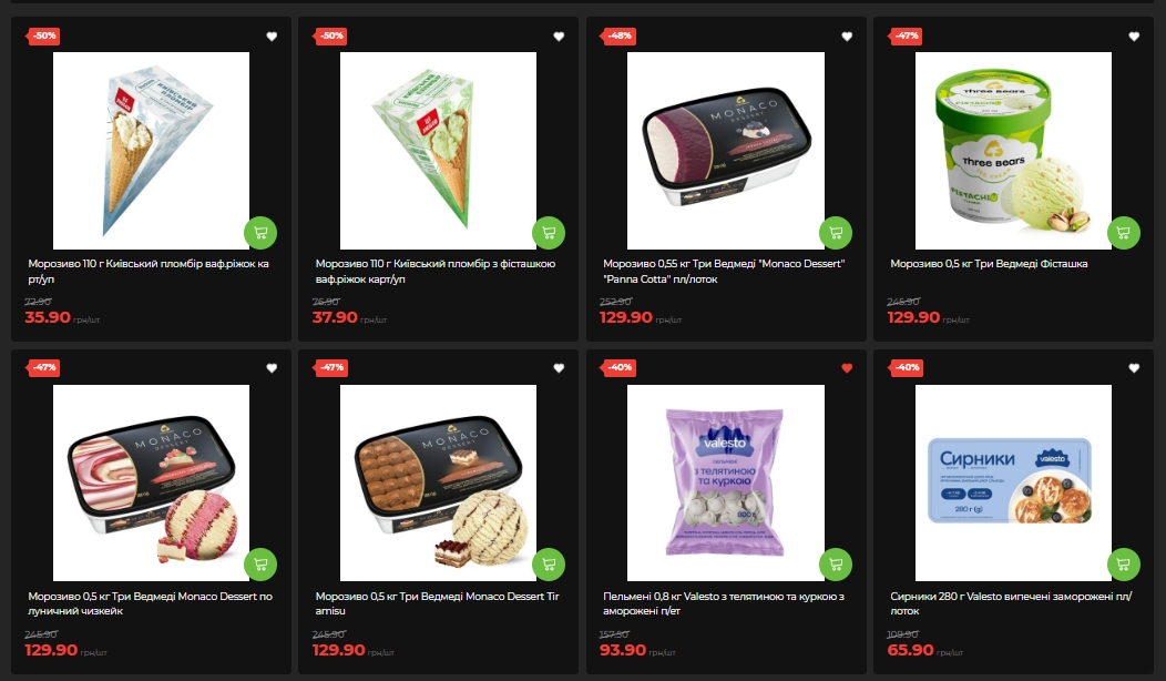 Мороженое "Киевский пломбир" (вафельный рожок 110 г) — минус 50%, 35,90 грн вместо 72,90. "Три Медведя" Monaco Dessert в трех вкусах — минус 47-48%. Пельмени Valesto (телятина и курица, 800 г) – минус 40%, 93,90 грн. Сырники Valesto замороженные – также минус 40%. Хачапури "День у День по-аджарски" — минус 38%.