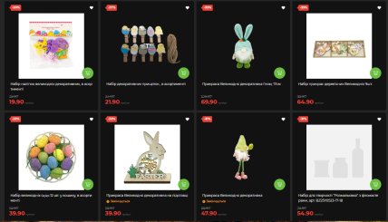 Набор наклеек пасхальных декоративных – минус 50%, 19,90 грн вместо 39,90. Набор декоративных прищепок – минус 37%. Гном декоративный 17 см – минус 35%. Набор деревянных украшений 9 шт – минус 35%. Набор пасхальных яиц в корзине 12 шт – минус 33%. Свеча пасхальная в стекле – минус 30%.