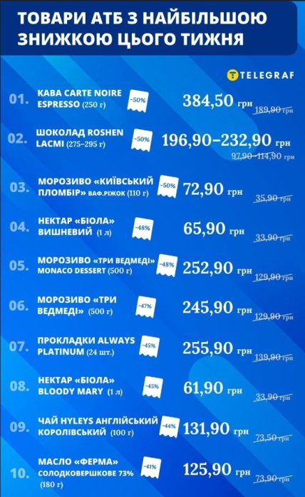 "Телеграф" собрал все актуальные акционные предложения "АТБ" со скидками более 30%, сгруппировал их по категориям и выделил топ-10 самых выгодных позиций недели.