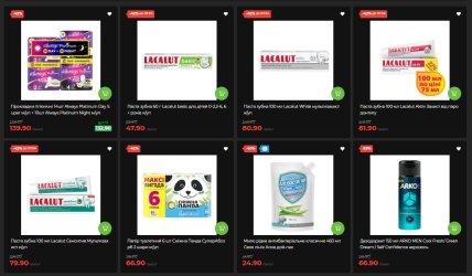 Прокладки Always Platinum (набор 24 шт) — минус 45%, 139,90 грн. Зубные пасты Lacalut (несколько видов) – минус 42% до 7 апреля. Туалетная бумага "Снежная Панда СуперАбсорб" 6 шт — минус 42%. Дезодоранты ARKO MEN – минус 39%. Гель для душа DURU 450 мл – минус 35%. Шампунь Kallos 1 л – минус 35%. Котекс (прокладки и тампоны нескольких видов) – минус 33%.