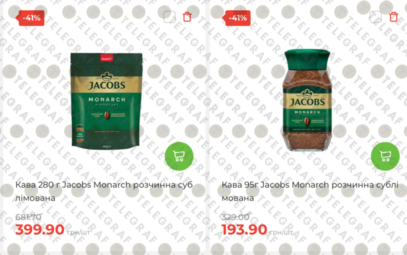 Значительные скидки действуют и на продукцию бренда Jacobs Monarch. Растворимый кофе в крупной эконом упаковке (280 г) подешевел на 41% — его цена упала с 681,70 грн до 399,90 грн. Компактная версия весом 95 г также подпала под акцию: вместо 329 грн ее можно приобрести за 193,90 грн.