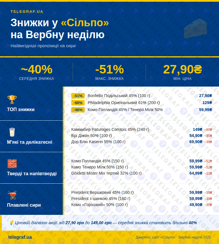 В популярном супермаркете "Сильпо" на Вербное воскресенье действуют скидки на сыры. Некоторые виды можно приобрести по большой акции — до 50%.