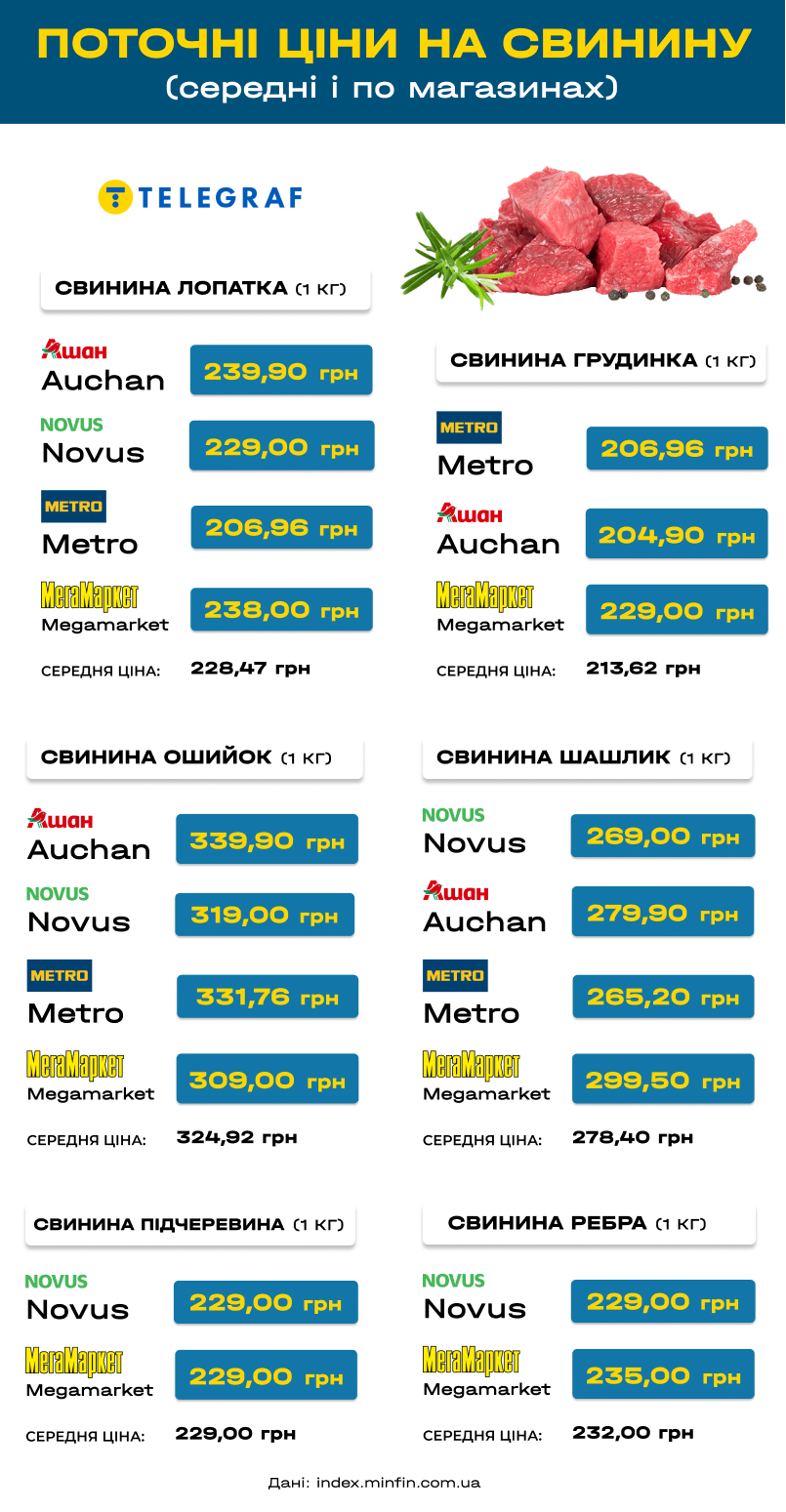 - Ошеек — в среднем 325 грн/кг (Auchan — 340, Novus — 319, Metro — 332, Megamarket — 309)