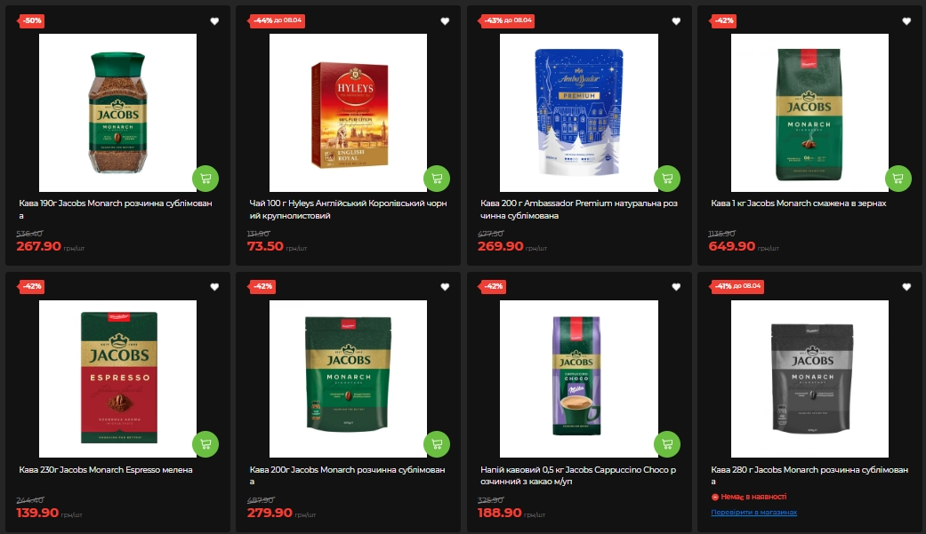 Кофе и чай – едва ли не самая впечатляющая часть текущих недельных акций. Кофе Jacobs Monarch в растворимом формате (190 г) упал в цене ровно вдвое — с 536 до 267,90 грн. Это одна из самых больших скидок среди всех категорий — минус 50%. Похожая ситуация с другими позициями Jacobs: кофе в зернах (1 кг) снизился с 1135 до 649,90 грн (-42%), молотый Espresso (230 г) — с 244 до 139,90 грн, а растворимый в упаковке 200 г — с 487 до 267.
