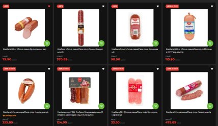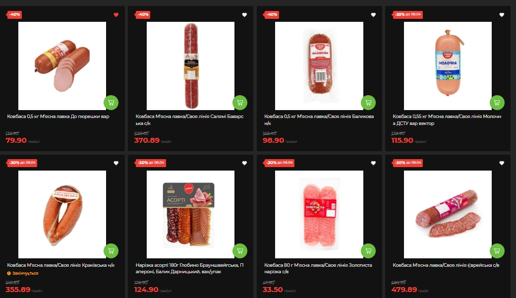 В мясном и колбасном отделе скидки тоже ощутимы. Колбаса "Мясная лавка/Своя линия" — вареная "К пюрешке" (0,5 кг) стоит 79,90 грн вместо 133,90 (-40%), Балыковая полукопченая (0,5 кг) — 98,90 вместо 165,40 грн (-40%), Салями 370,89 грн/кг. Молочная ДСТУ (0,55 кг) — 115,90 вместо 179,90 грн (-35%). Паштет утиный от Тернопольского мясокомбината (225 г) — 42,50 вместо 63,90 грн (-33%).