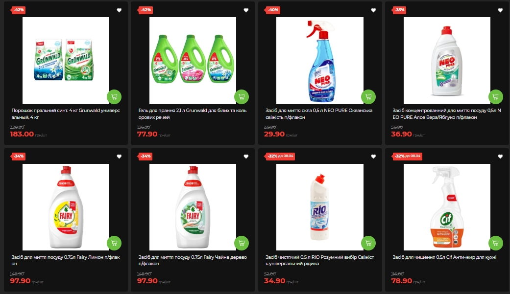 Бытовая химия подверглась серьезной акции. Стиральный порошок Grunwald (4 кг) — минус 42%, 183 вместо 320,90 грн. Гель для стирки Grunwald (2,1 л) – также -42%, 77,90 вместо 136,50 грн. Средство для мытья стекла NEO PURE (0,5 л) – минус 40%, 29,90 грн. Fairy (0,75 л, лимон или чайное дерево) – минус 34%, по 97,90 вместо 148,90 грн.