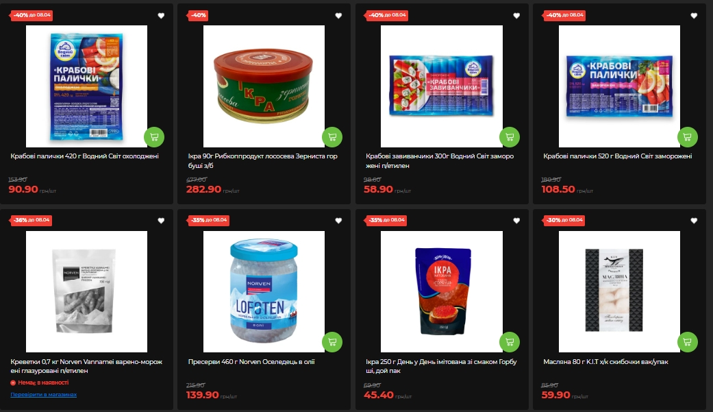 В рыбном отделе внимание привлекает икра горбуши (90 г, "Рыбкопродукт") — минус 40%, 282,90 грн вместо 477 грн. Крабовые палочки "Водный Мир" (420 г, охлажденные) — 90,90 вместо 153,90 грн (-40%). Пресервы сельди Norven (460 г, в масле) – 139,90 вместо 215,90 грн (-35%). Семга Norven (210 г, слабосоленая) — 267,90 вместо 383,30 грн (-30%). Форель Norven (240 г) – 299,90 вместо 429,90 грн (-30%).