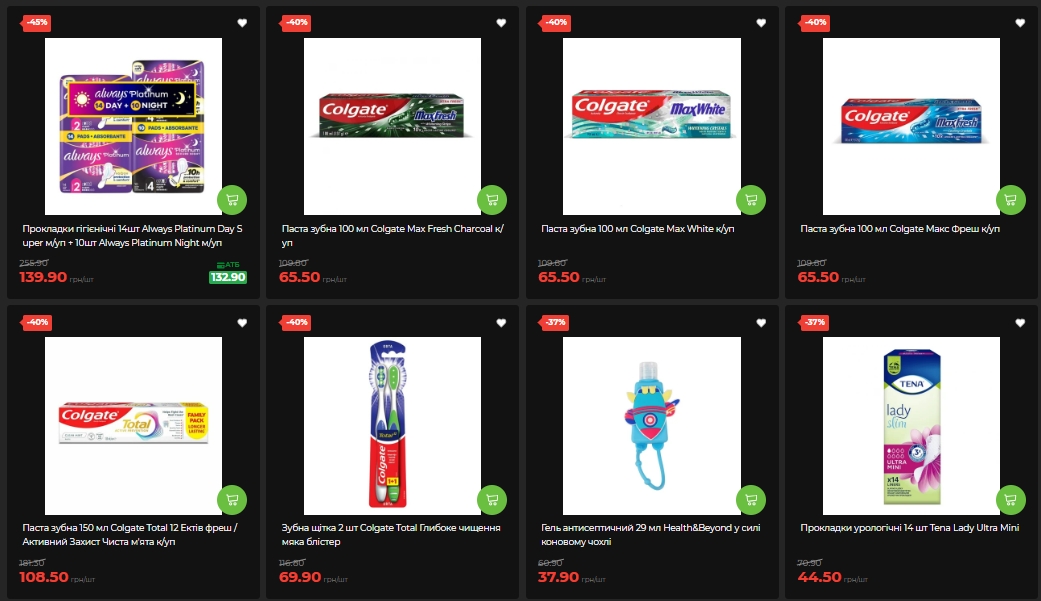 В средствах личной гигиены выделяются зубные пасты Colgate (100-150 мл, разные серии) — минус 40%, по 65,50-108,50 грн вместо 109-181 грн. Прокладки Always Platinum (набор 14+10 шт) – минус 45%, 139,90 вместо 255,90 грн. Шампунь Gliss Kur (400 мл) – минус 35%, 123,90 вместо 193,50 грн. Подгузники-трусики Tena для взрослых (10 шт, размер M или L) – минус 32%, от 209,90 до 238,90 грн.