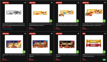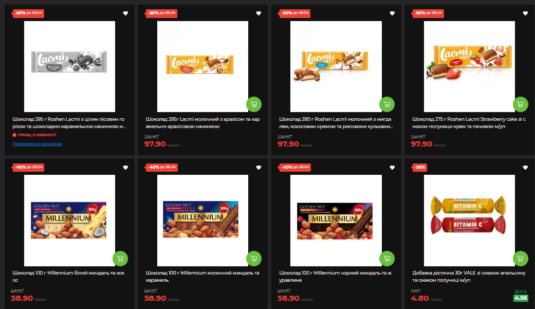 Сладости на этой неделе – отдельная история. Шоколад Roshen Lacmi сразу в нескольких вариантах (с арахисом, миндалем, клубникой — упаковки по 275-295 г) продается за 97,90 грн вместо почти 197 грн. Это ровно -50% – самая большая скидка среди кондитерки. Шоколад Millennium (100 г, разные вкусы – белый с миндалем и кокосом, молочный с карамелью, черный с клюквой) – со скидкой 40%, по 58,90 грн вместо почти 99 грн.
