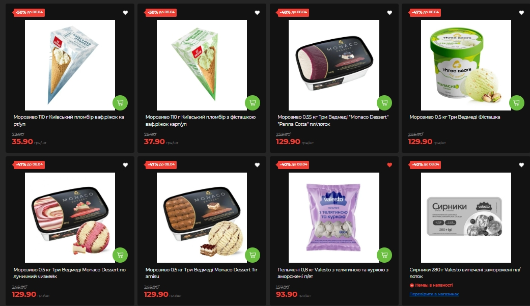 В отделе заморозки самые заметные скидки – на мороженое. Мороженое "Киевский пломбир" в вафельном рожке (110 г) — -50%, 35,90-37,90 грн вместо 72-76 грн. Мороженое "Три Медведя" Monaco Dessert (0,55 кг, Panna Cotta) — минус 48%, 129,90 вместо 252,90 грн. Три Медведя Фисташко и Monaco Dessert Tiramisu (0,5 кг) — минус 47%, 129,90 вместо 245,90 грн.
