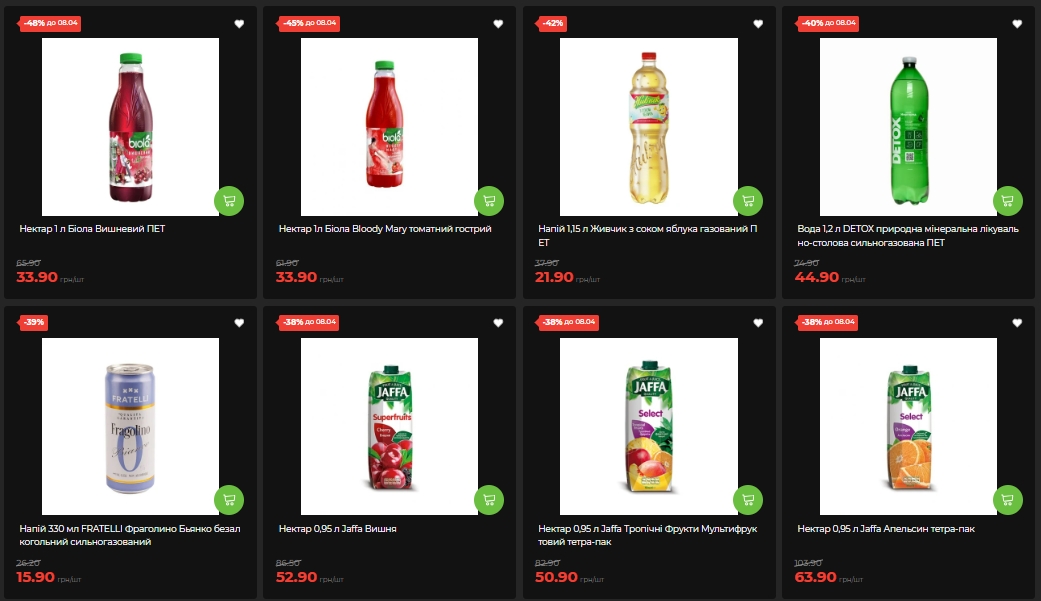 Среди напитков наибольшую скидку получил нектар Биола Вишневый (1 л, ПЭТ) – минус 48%, 33,90 грн вместо 65,90 грн. Нектар Биола Bloody Mary (1 л) – минус 45%, также 33,90 грн. Живчик (1,15 л, газированный) — минус 42%, 21,90 вместо 37,90 грн. Минеральная вода DETOX (1,2 л, сильногазированная) — минус 40%, 44,90 вместо 74,90 грн.