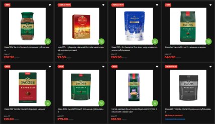 Nescafe Gold также попала под акцию: 200 г стоит 305,90 грн вместо 470,90 (-35%), а большая упаковка на 280 г — 413,50 вместо 636,50 грн. Ambassador Premium (200 г, растворимый) со скидкой 43% продается за 269,90 грн. Среди чаев выделяется Hyleys Английский Королевский (100 г) – минус 44%, то есть 73,50 грн вместо 131,90. Ahmad Tea и Мономах также находятся в акции со скидками 35%.