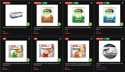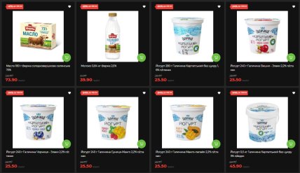 Крем-сыр Philadelphia (125 г, классический или легкий) снизился на 30% и стоит 90,90 вместо 129,90 грн. Сыр Dziugas (180 г, Литва) — 139,90 вместо 199,90 грн (-30%). Сыры Ryki (Цезарь, Эдам, Маасдам, 135 г) – по 61,90 вместо 88,90 грн (-30%). Йогурты Галичина (серия Карпатский и с наполнителями) — со скидкой 34%, по 25,50 грн вместо 38,90 грн. Сметана "ПростоНаше" (300 г, 15%) — 36,50 вместо 52,90 грн (-31%).