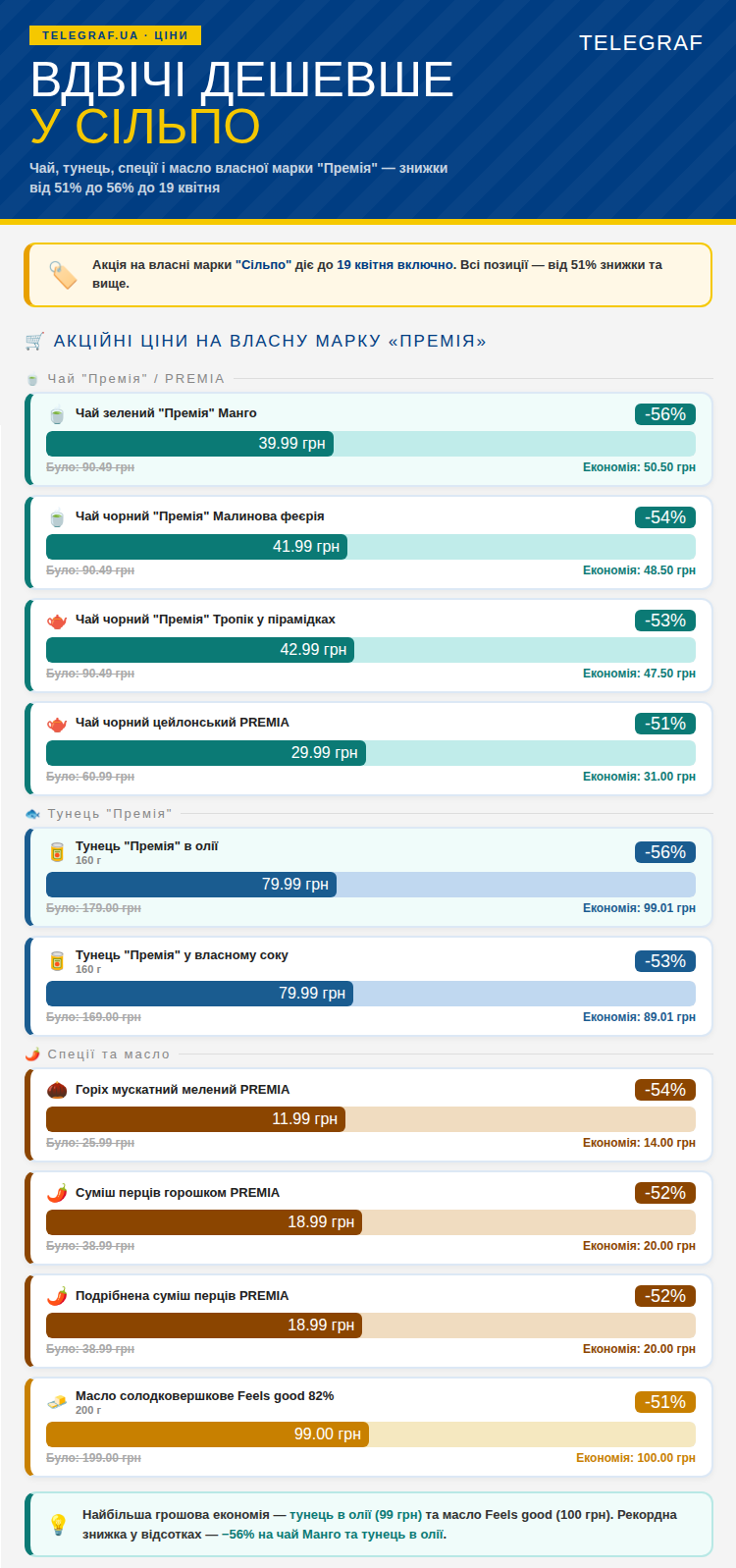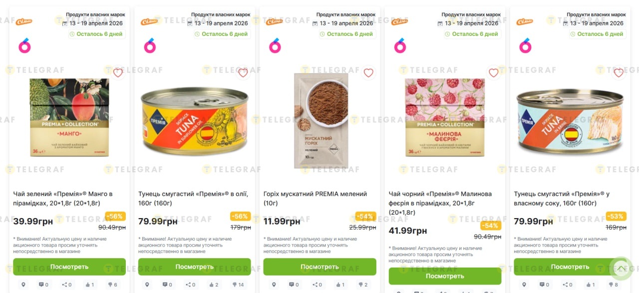 - Тунец "Премия" в масле, 160 г — 79.99 грн (было 179 грн, скидка -56%, экономия 99.01 грн);