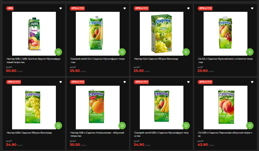 В частности, продукция "Садочок" подешевела на 37%. Нектар яблоко-виноград объемом 0,95 л можно приобрести за 34,90 грн вместо 55,90 грн, а томатный сок — за 43,90 грн вместо 69,90 грн. Также со скидкой 38% доступен нектар "Jaffa" "Тропические фрукты" (0,95л), который стоит 50,90 грн вместо 82,90 грн.