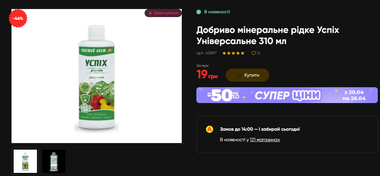 Удобрения и семена также попали в акционный список: жидкое удобрение Успех Универсальное 310 мл — 19 грн вместо 34 (-44%), порошки O’KEY Universal Лаванда и Мята 400 г — по 32 грн вместо 49 (-35%), субстрат Green Rich 4 (-31%).