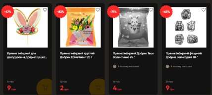 Пищевые продукты и сладости представлены в акции скромнее, но действительно выгодные позиции. Пряник имбирный Добрик Комплимент 25 г продают за 2 гривны вместо 12 – это рекордные минус 83% среди всех акционных товаров недели. Маршмелоу Becky’s Easter 200 г снизилось с 99 до 29 гривен (-71%).