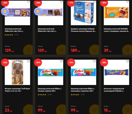 Шоколад Milka Чизкейк 300 г с клубничной начинкой и печеньем стоит 149 гривен вместо 219 (-32%). Шоколад Roshen Lacmi с миндалем и кокосом 84 г – 39 гривен вместо 55 (-29%). Батончики E.Wedel двух видов – с арахисовой начинкой и тоффи – по 15 и 18 гривен соответственно вместо 24 и 27 (-33-38%). Чипсы Люкс со вкусом сметаны и краба по 105 г опустились с 64 до 47 гривен каждый (-27%).