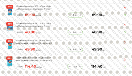 Особое внимание сеть уделила продукции собственной марки "Своя линия". Большую упаковку замороженных крабовых палочек весом 500 г (производства Литвы) можно приобрести за 89,90 грн. вместо прежних 129,90 грн., а меньший формат этого же продукта весом 250 г. обойдется всего в 48,90 грн. вместо 69,90 грн. В обоих случаях экономия составляет приличные 30%.