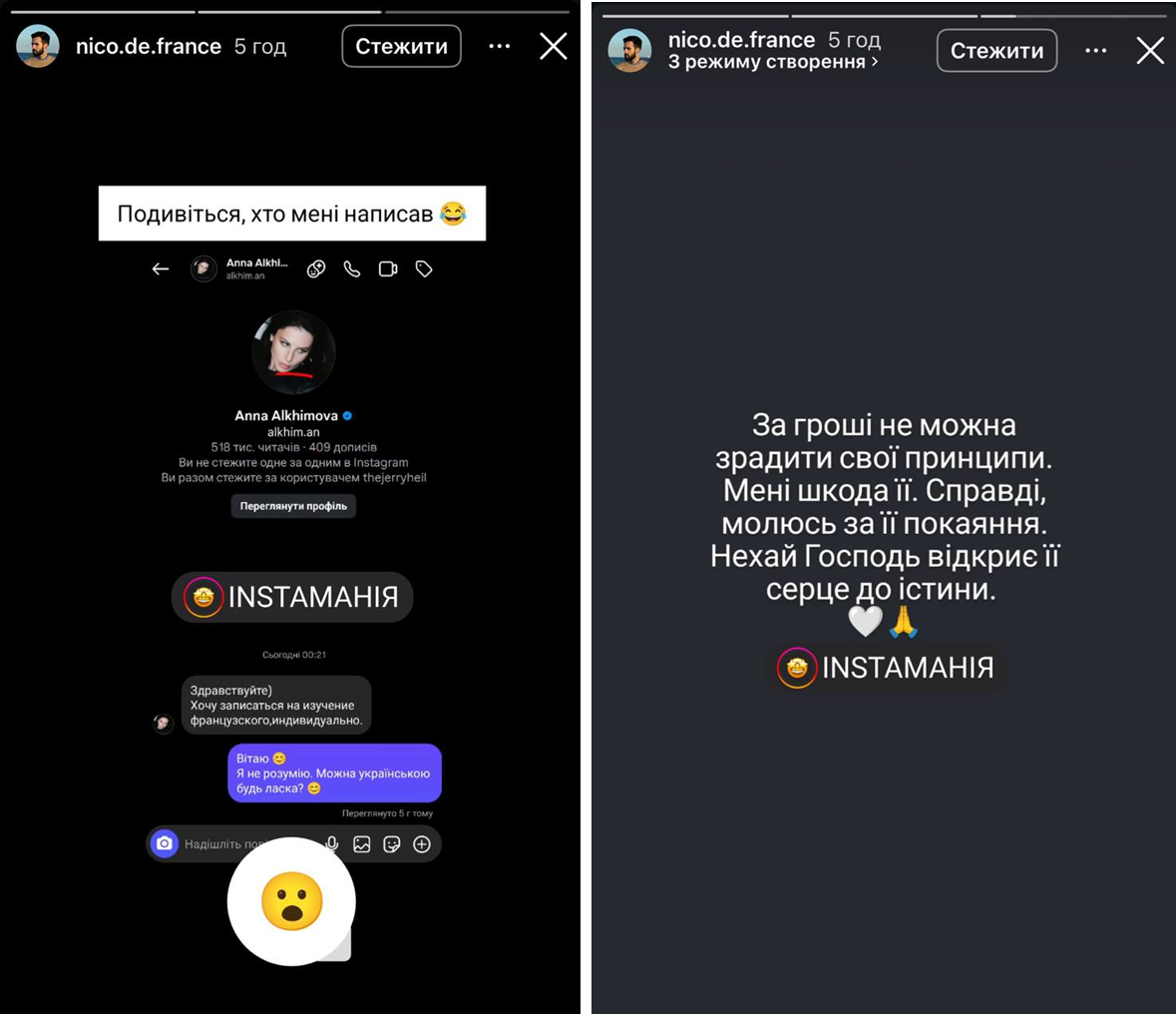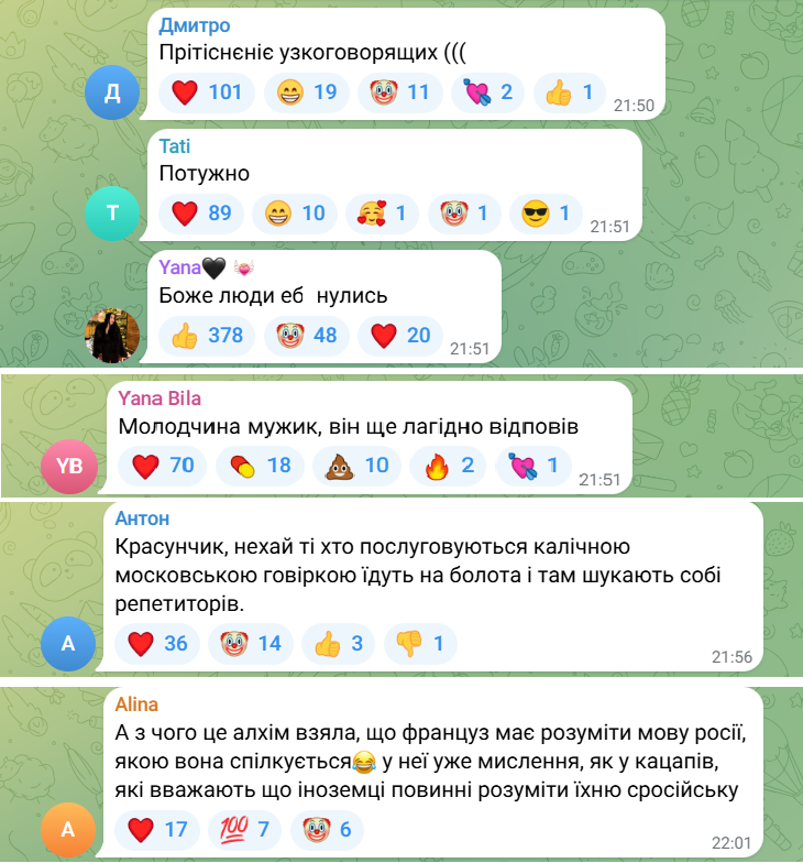 Как оказалось, Алхим обратилась к украиноязычному французу-блогеру Николасу, который преподает французский язык. Она написала ему в соцсети с просьбой взять уроки языка, но сделала это на русском языке.