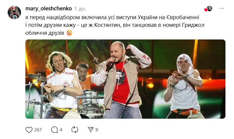 • Я перед Нацотбором включила все выступления Украины на Евровидении. И потом друзьям говорю: это Константин, он танцевал в номере "Гриджол".