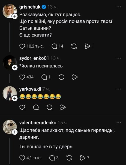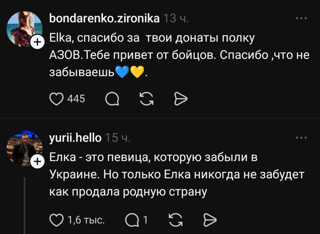 Недавнее появление Елки в Threads вызвало новую волну обсуждений. Украины сплотились и жестко напомнили о ее молчании и выборе. В комментариях многие прямо дали понять — здесь ей не рады: