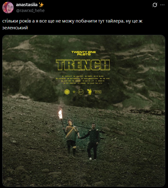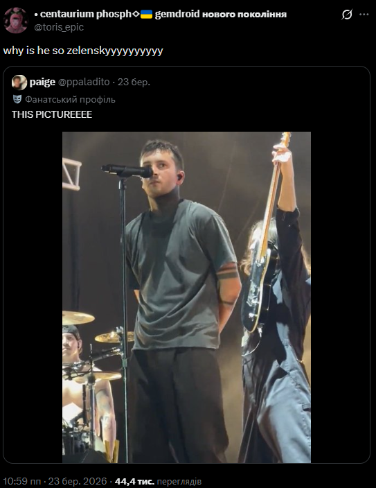 Пользователи платформы X (бывший Twitter) заметили, что 37-летний фронтмен популярной американской группы Twenty One Pilots Тайлер Джозеф выглядит как "копия" Владимира Зеленского.
