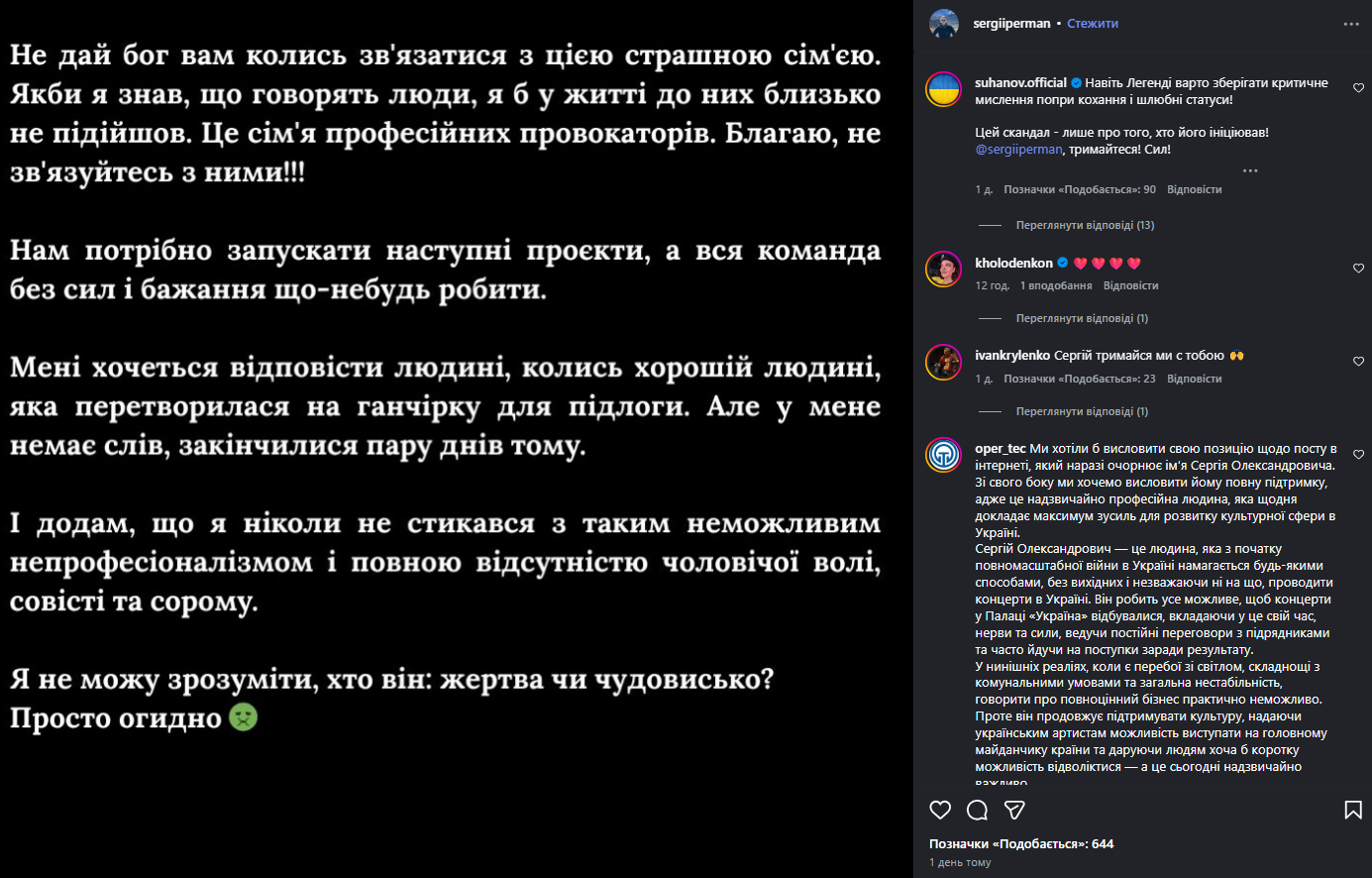 В настоящее время Перман — советник генерального директора Дворца "Украина". Напомним, что в марте 2026 года он оказался в центре публичного конфликта с Виктором Павликом и его женой Екатериной Репяховой из-за условий проведения юбилейного концерта артиста. Перман назвал пару "страшной семьей" и "профессиональными провокаторами".