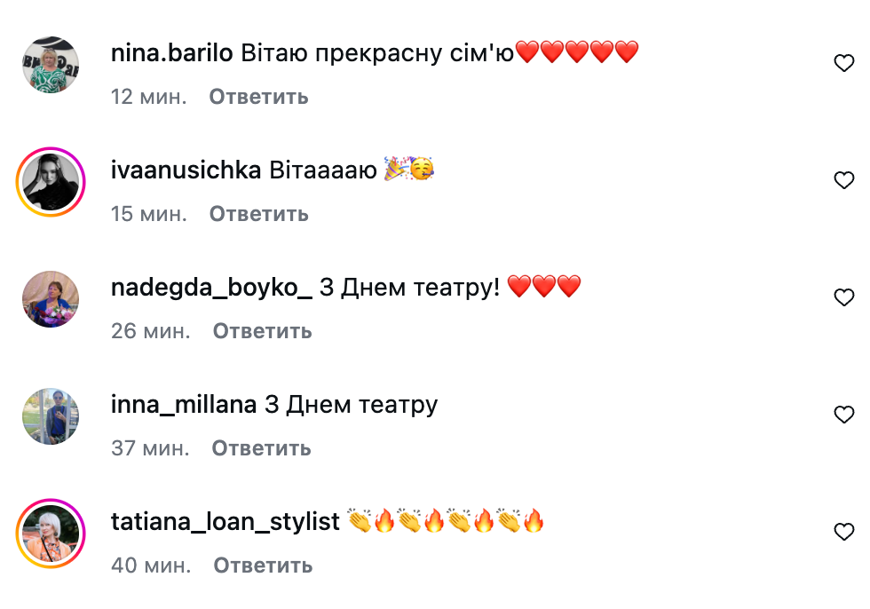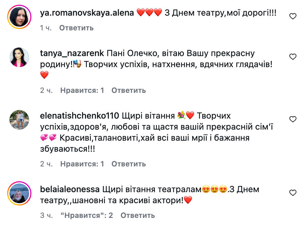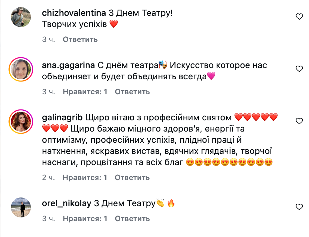 • "С Днем театра, Вашу семью! Невероятно талантливы! Желаю здоровья и счастливой жизни под мирным небом!";