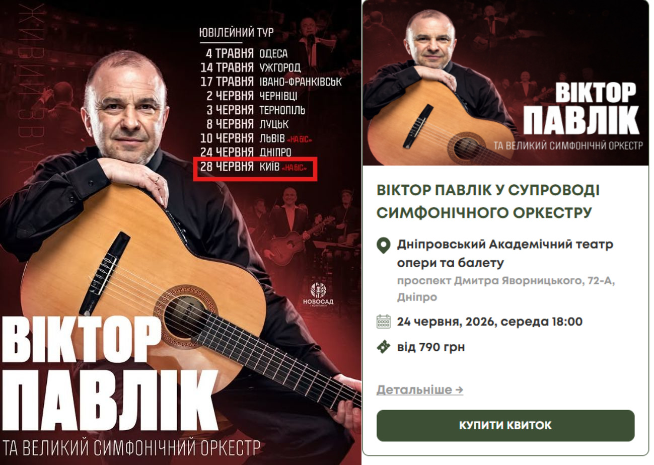 На этот раз местом встречи указан Дворец спорта — главный "конкурент" Дворца "Украина". Здесь Павлик планирует закрыть свой юбилейный тур грандиозным выступлением на бис.