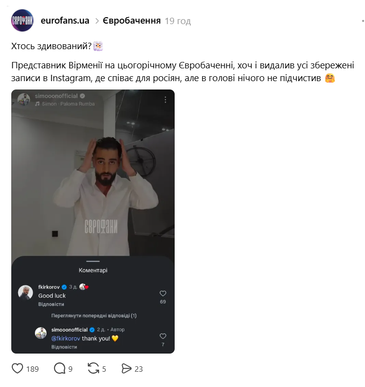 Так, на странице eurofans.ua в соцсети Threads опубликовали интересный скриншот и обвинили его в связях с Россией и россиянами. Как оказалось, новое видео Simón в Instagram, на котором звучит его конкурсная песня "Paloma Rumba", прокомментировал российский поп-король Филипп Киркоров. Он написал "Good luck", а певец ответил ему благодарностью.