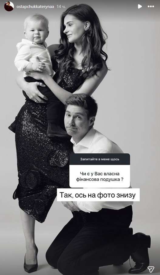 Девушка опубликовала совместное фото с мужем и их маленьким сыном Тимофеем. На фото Владимир Остапчук стоит на коленях, прижимая к себе ногу жены. "Да, вот на фото снизу", – лаконично подписала кадр Екатерина, намекая на то, что ее главным финансовым гарантом является именно мужчина.