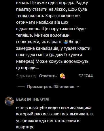 "Это очень достойный совет. Советую палатку ставить на кровать, чтобы был теплый пол. Сейчас главное не получить последствия от этих отключений. Еще пару недель и будет теплее…";