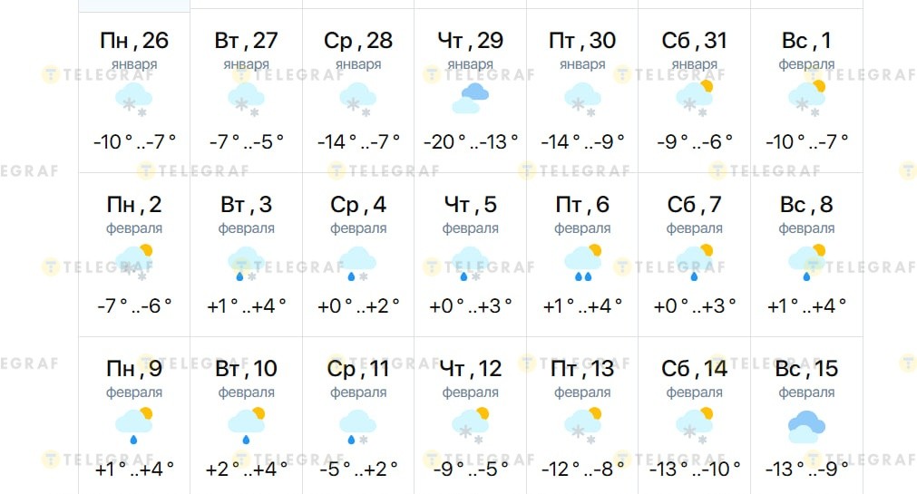 Конец января и начало февраля в столице останутся холодными — ночью температура будет колебаться в диапазоне -20…-7 °С, а днем будет держаться в пределах -13…-5 градусов. Самый холодный день прогнозируется в четверг, 29 января. Почти всю неделю будет идти снег.