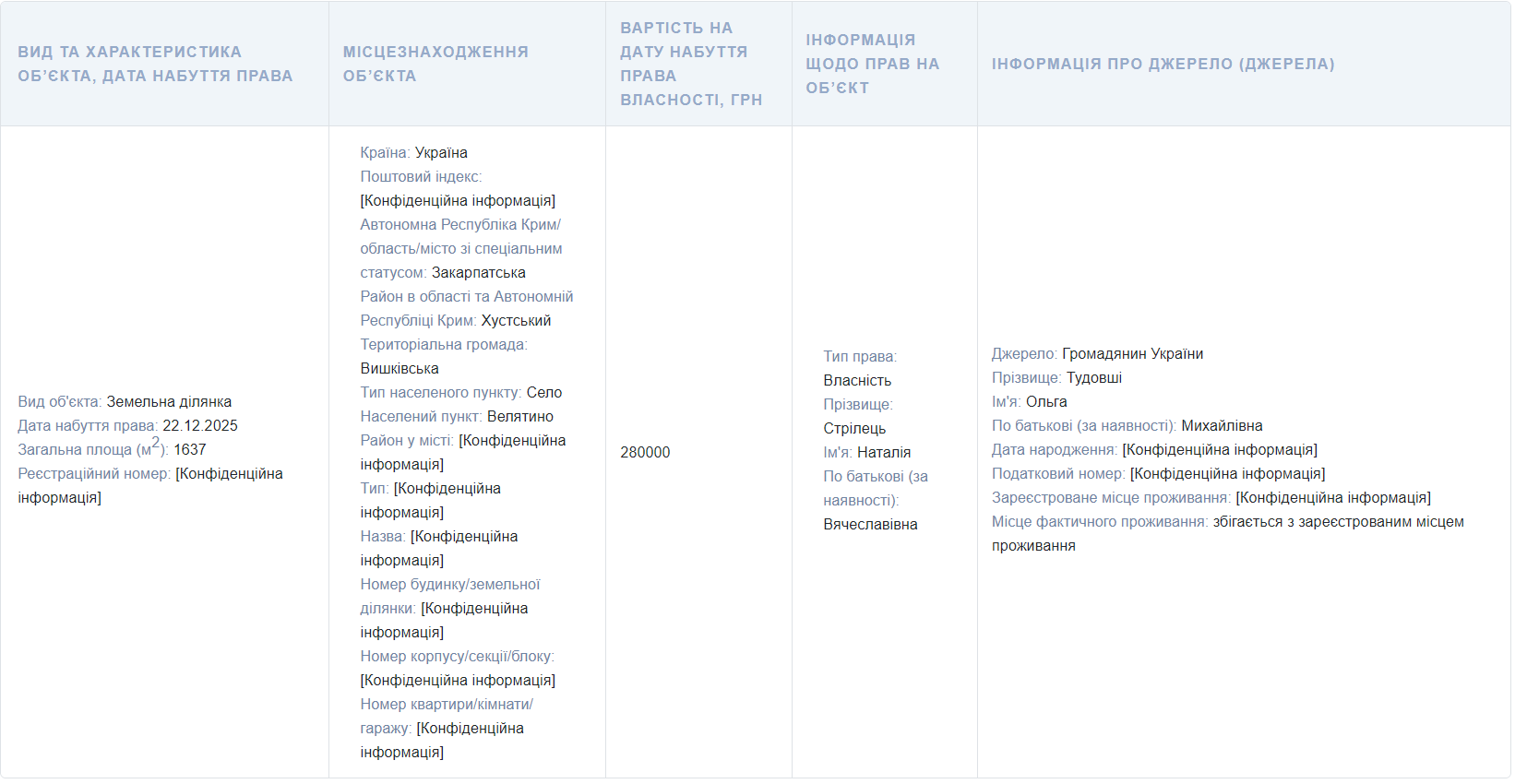 Через одиннадцать дней судья совершила еще одну большую покупку. 22 декабря 2025 года женщина приобрела земельный участок площадью 1637 квадратных метров. Недвижимость расположена в селе Велятино Хустского района Закарпатья.