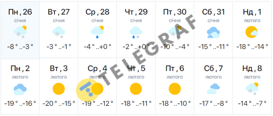 Всю следующую неделю, согласно данным Мeteo.ua, морозы будут держаться на уровне -15 до -20 градусов ночью. Днем температура не будет подниматься выше -10...-15 градусов мороза.