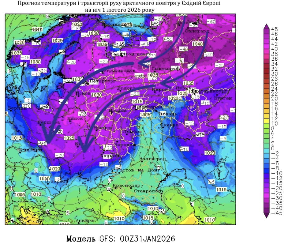 Холод следует в Украину со стороны Карского моря и Новой Земли через Восточноевропейскую равнину под влиянием молодого арктического антициклона и его выступления в сторону Украины, что показано на карте ниже.