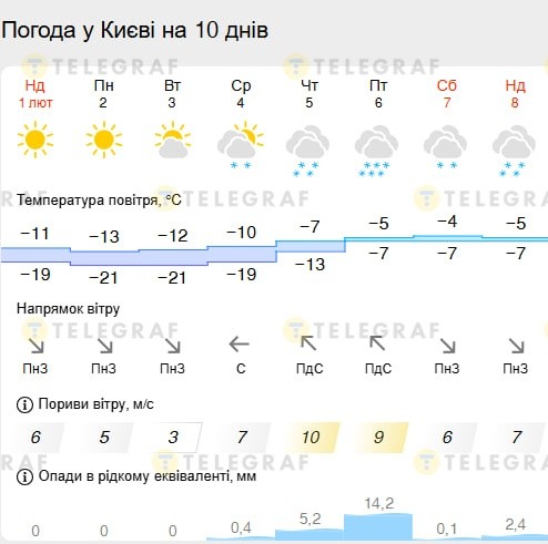 В выходные, 7-8 февраля, температурный фон будет оставаться без изменений. Днем в Киеве ожидается -4…-5 градусов, ночью — около -7. Осадки сохранятся, что вместе с колебанием температуры может вызвать сложные условия на дорогах и тротуарах.