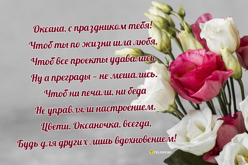 Милая Оксана, пусть твой ангел ведет тебя за руку к самым заветным целям. Желаю, чтобы удача стала твоей верной спутницей, а каждый новый день приносил вдохновение. Будь счастлива и любима вопреки всему!