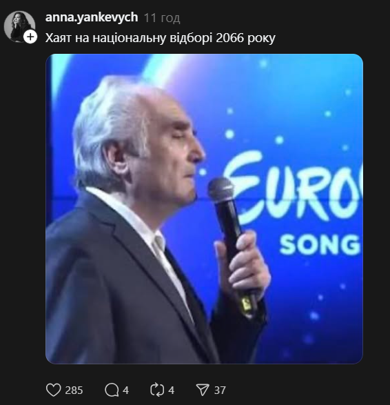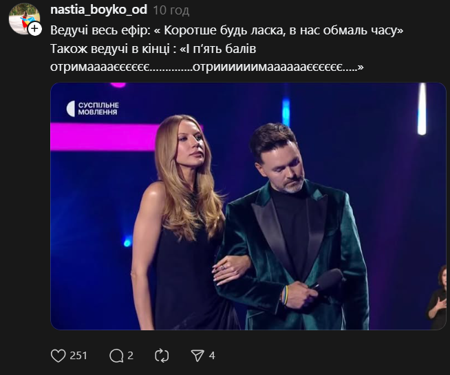 Пока в эфире разворачивались драмы, украинцы делали контент. Популярная соцсеть Threads взорвалась шутками обо всем: от поведения ведущих Тимура Мирошниченко и Леси Никитюк до технических нюансов выступлений финалистов.