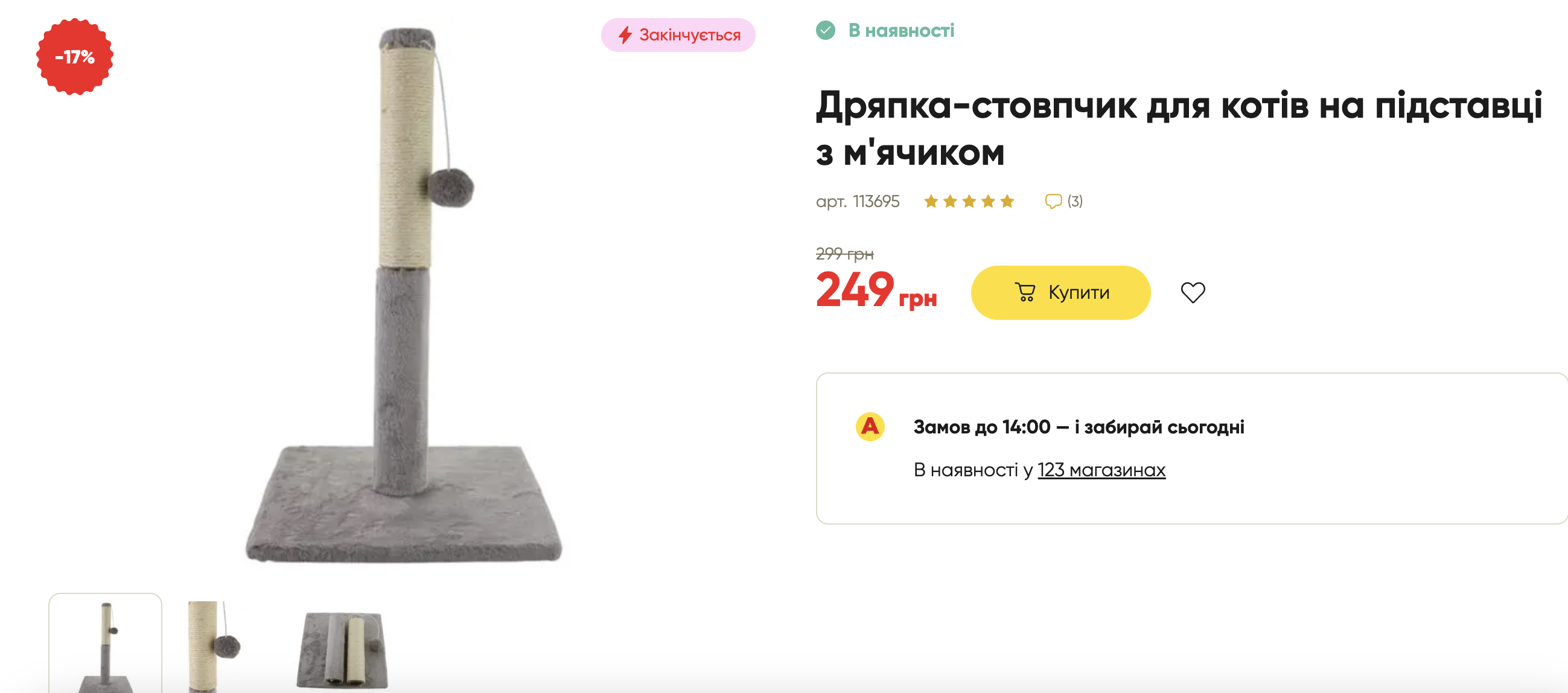 Отметим, что на сайте указано, что в настоящее время скидка на когтеточку составляет 17%. Она стоит 249 грн. вместо 299 грн. К слову, даже без акции цена на кошачий аксессуар достаточно низкая.