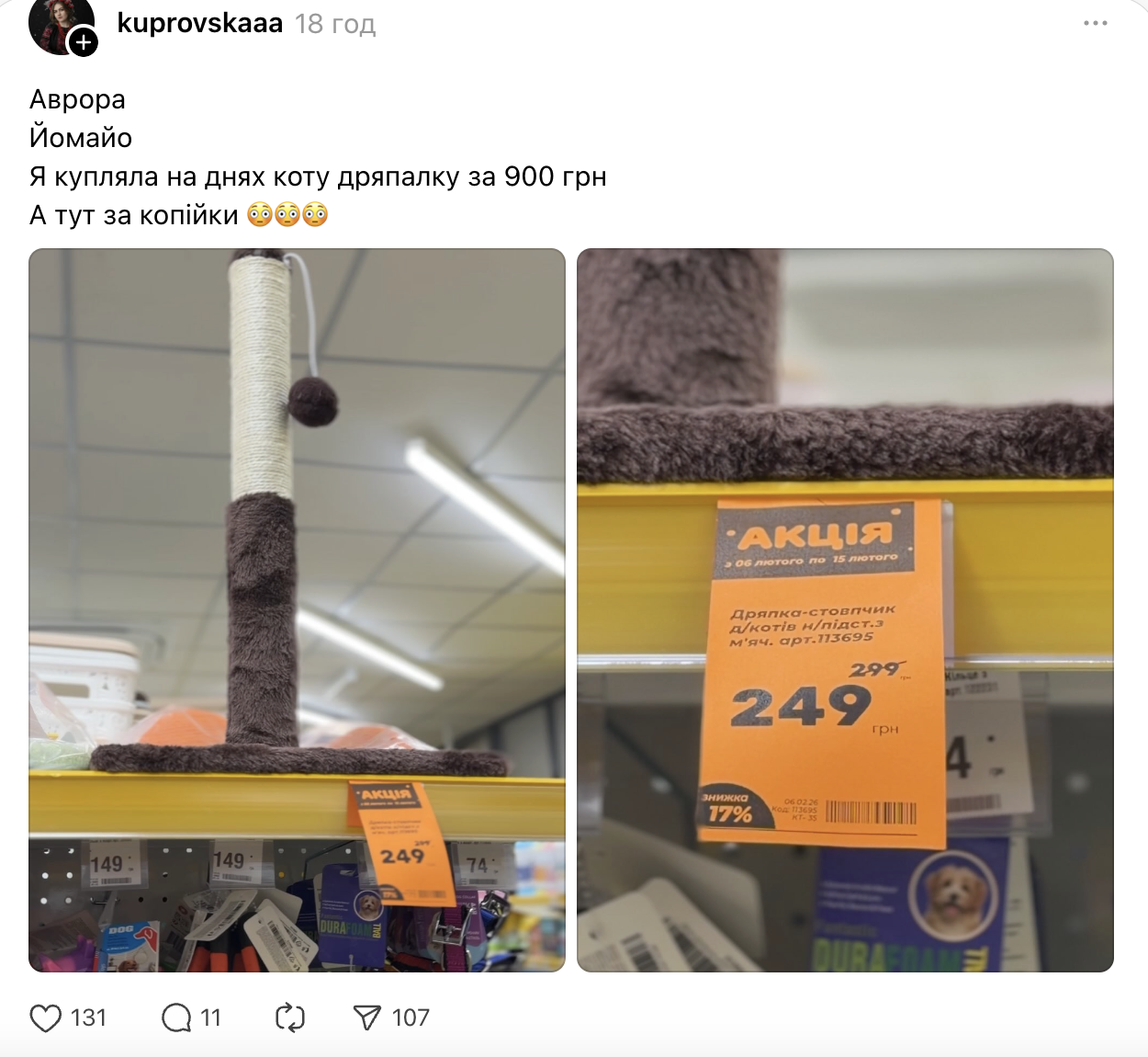 "Я покупала на днях коту когтеточку за 900 грн. А здесь за копейки", — говорится в сообщении.