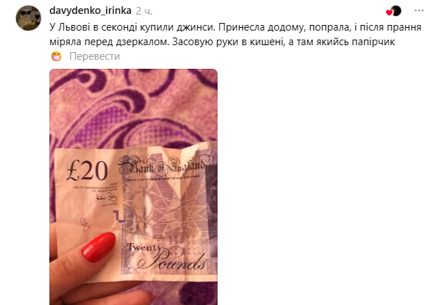 Согласно комментариям, одной из самых частых находок являются деньги, при чем самые разные валюты и сумы. Одна из покупательниц рассказала, как нашла в кармане 920 евро, а вторая нашла в джинсах 20 фунтов стерлингов.