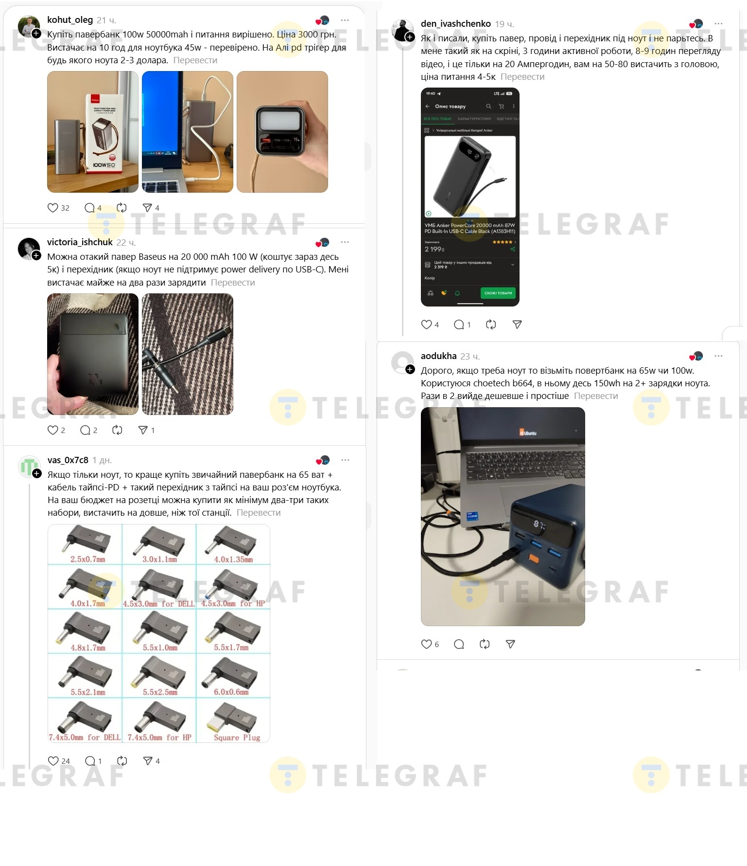 В ответах большинство пользователей рассказали, что используют повербанки, покупая дополнительные кабели и переходники для ноутбука.