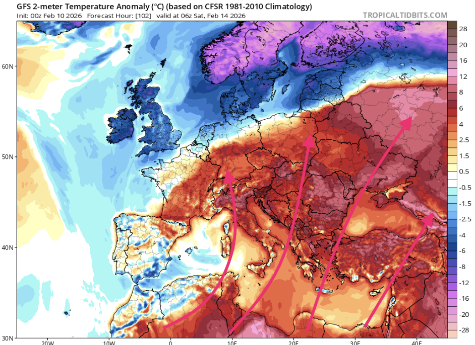 На карте для наглядности представлено поле аномалии температуры воздуха в Европе на 14 февраля, а также показана приблизительная траектория перемещения воздушных масс: