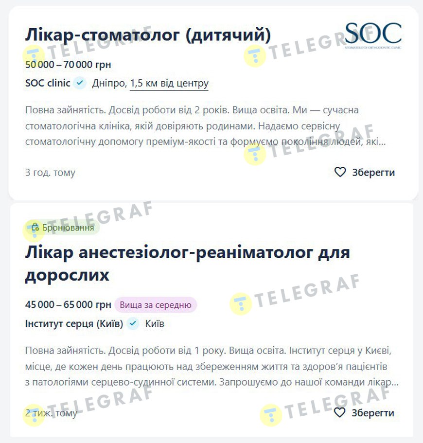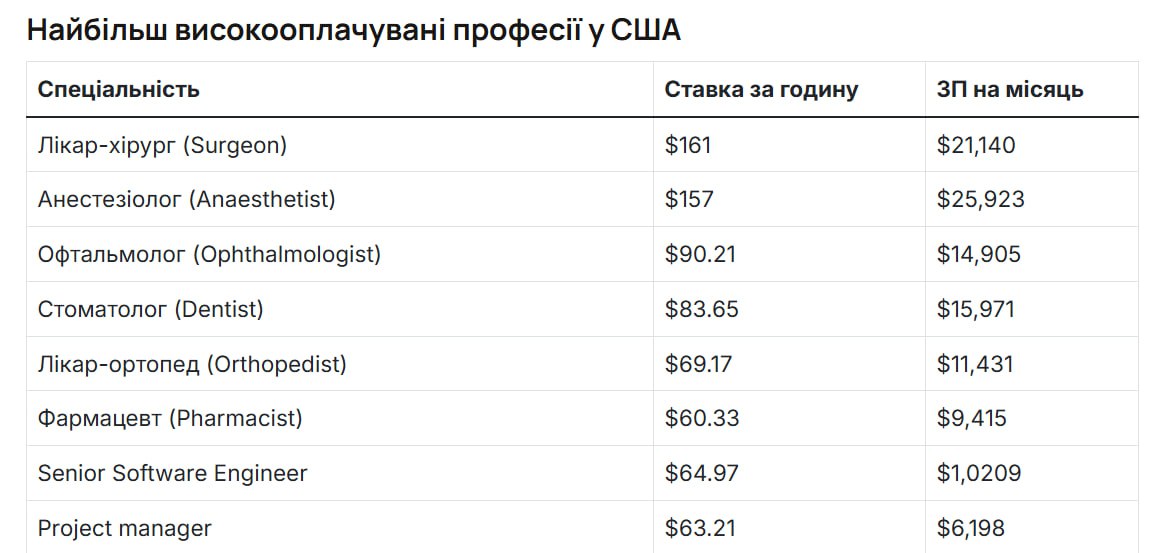 За рубежом, например в США, врачи — одни из самых высокооплачиваемых профессий. К примеру, по состоянию на 2024 год врач-хирург в Америке зарабатывал в среднем 21 тысячу долларов в месяц. Следует учитывать, что украинские медицинские дипломы в США и большинстве западных стран не признаются автоматически — для работы врачом необходимо повторно подтверждать образование, сдавать лицензионные экзамены и проходить резидентуру, что фактически означает переучиваниеим.