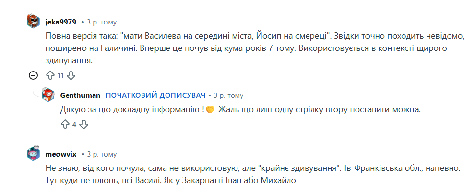 Один из комментаторов привел полную версию фразы: "мати Василева на середині міста, Йосип на смереці". Используется в контексте искреннего удивления.