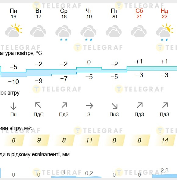 - Воскресенье: -1 °С днем, -6 °С ночью, возможны осадки в виде снега и дождя.