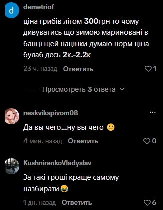 "Цена грибов летом 300 грн, то почему удивляться что зимой маринованные в банке еще наценки. Думаю норм цена была где-то 2 к — 2.2 к";